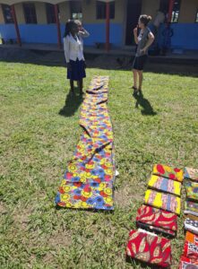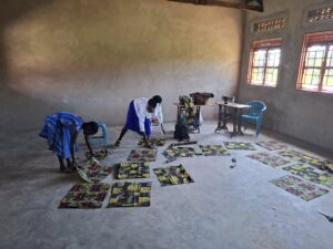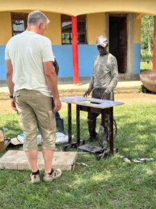 Ein neuer Tag mit neuen Aufgaben. Zurück am Ausbildungszentrum verteilen wir Stoffe und Nähzubehör für neue Projekte. Herny hilft beim Verglasen der Fenster und erklärt den Arbeitern vor Ort, die von uns mitgebrachten Werkzeuge.