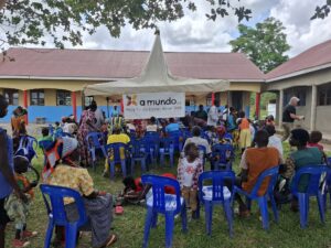 Wir sind am Ausbildungszentrum angekommen, es gibt ein Schulfest als Willkommensgeste. Unsere Studenten und Witwen kochen für uns. Wir bekommen Geschenke, A mundo T-shirts und einen Hahn. Am nächsten Tag kommen noch zwei Hühner hinzu. Es wird gesungen und getanzt.